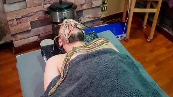 تنبعث الموسيقى هادئة، من إحدى غرف منتجع صحي صغير بالقاهرة، في حين تزحف ثعابين حية على ثغور ووجوه الزبائن لتخليصهم من آلامهم، فالمدلكون يضعون الزيت على ظهور الزبائن أولًا ويدلكونها ثم يستخدمون الثعابين من أكثر من 28 نوعًا مختلفًا من فصائل غير سامة للمشاركة في جلسات تدليك تفرز الأدرينالين في الجسم.