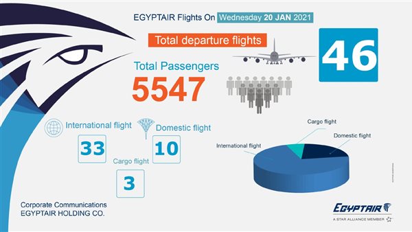 تسير مصرللطيران بمطار القاهرة الدولي، غدا الأربعاء، 46 رحلة جوية بمعدل 33 رحلة دولية إلى كل من بيروت، جدة، المدينة المنورة، بغداد، الرياض، دبي، لندن، الدمام، باريس، اسطنبول،الدوحه، روما، البحرين، الخرطوم، عمان، الشارقة، أديس أبابا،مسقط،ميلانو، نيويورك، أمستردام و10 رحلات داخلية إلى كل من شرم الشيخ والغردقة والأقصر وأسوان، و3 رحلات شحن جوى، تنقل جميع هذه الرحلات أكثر من 5547 راكبا.