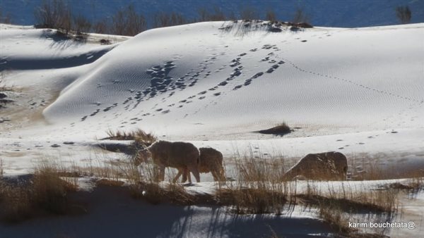وتساقطت الثلوج بالقرب من بلدة عين الصفراء الصحراوية في الجزائر هذا الأسبوع، مما دفع المصور لالتقاط بعض الصور والمشاهد للجليد وهو يغطي الرمال في البلدة الصحراوية.