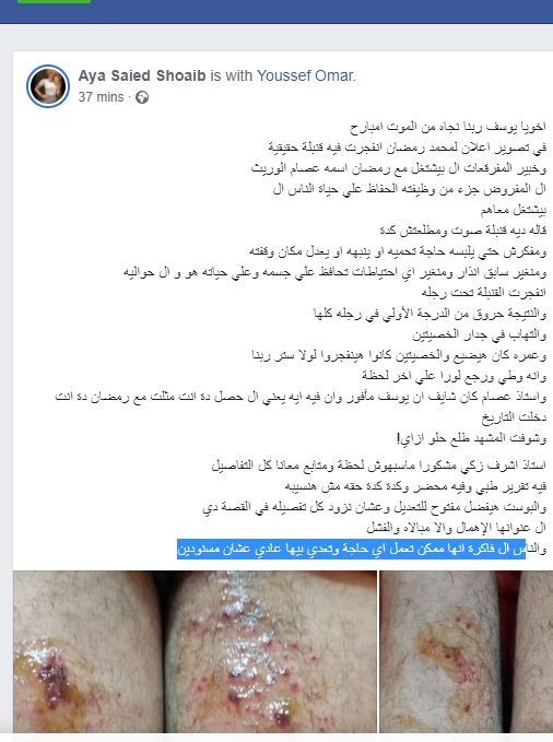 وكتبت عبر حسابها على “فيس بوك” إنها شقيقة يوسف عمر، أحد المشاركين في الإعلان، والذي أصيب بحروق من الدرجة الأولى خلال مشاركته في التصوير.