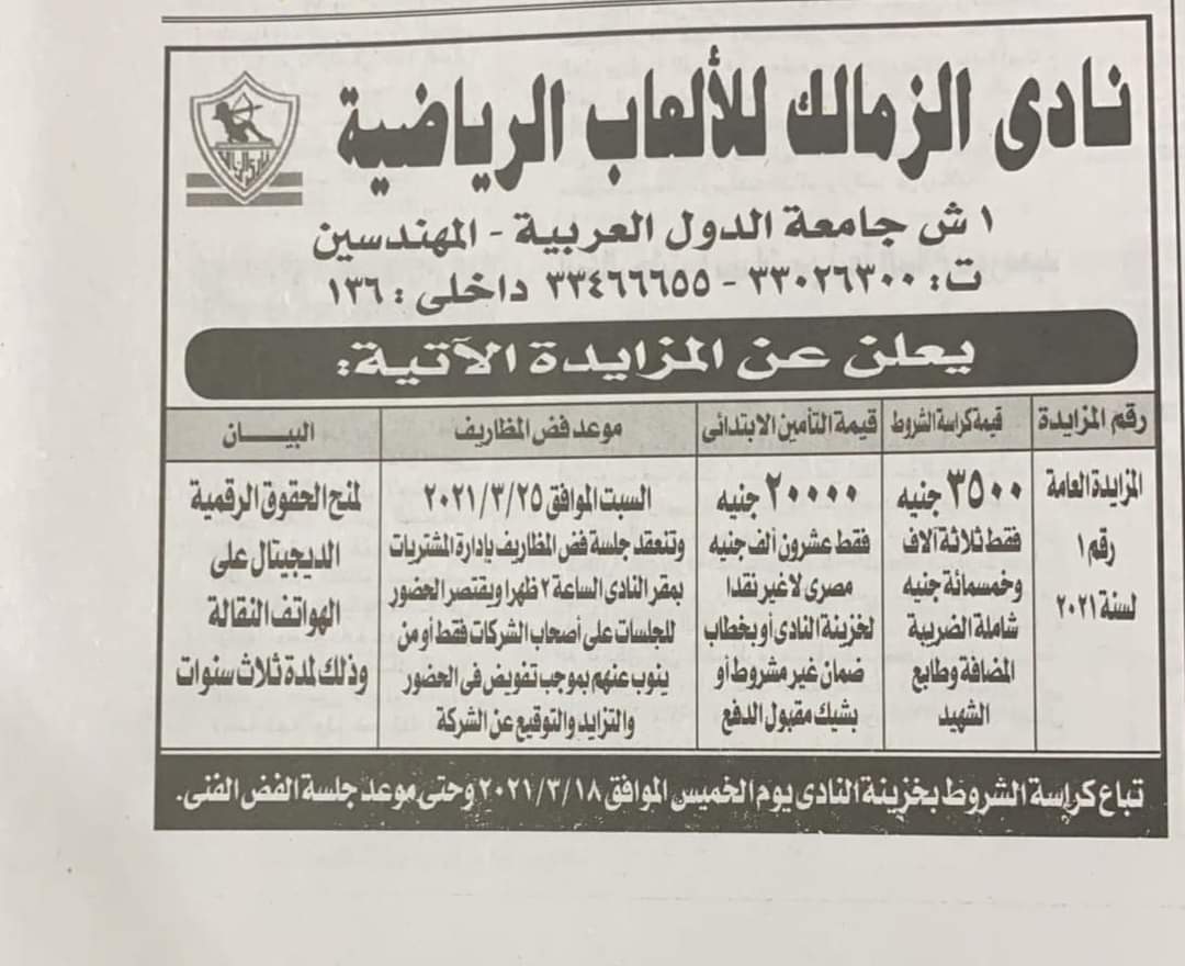 أعلن نادي الزمالك إجراء مزايدة علنية من أجل منح حقوق النادي الرقمية الديجيتال على الهواتف النقالة لمدة ثلاث سنوات من أجل ضخ مزيد من الأموال في خزينة النادي الأبيض.