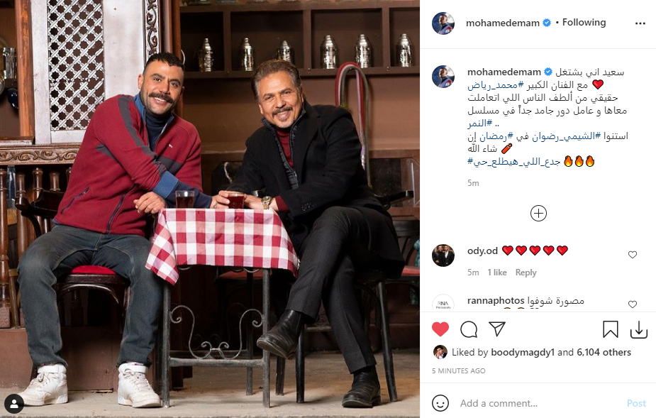 ونشر إمام عبر حسابه الرسمي بموقع الصور والفيديوهات “انستجرام”، صورة جمعته بالفنان محمد رياض من الكواليس، وعلق عليها قائلًا: “سعيد أني بشتغل مع الفنان الكبير محمد رياض.. حقيقي من ألطف الناس اللي اتعاملت معاها وعامل دور جامد جدًّا في مسلسل النمر".