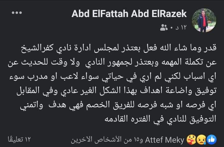 وكتب عبد الرزاق على حسابه الشخصي على موقع التواصل الاجتماعي فيس بوك: "قدر الله وما شاء فعل بعتذر لمجلس إدارة نادي كفر الشيخ عن تكملة المهمة واعتذر للجمهور، ولا وقت للحديث عن الأسباب، ولكن لم أرَ في حياتي كلاعب أو مدرب سوء توفيق وإضاعة أهداف وفرص بهذا الشكل، في المقابل أي فرصة أو شبه فرصة للفريق الخصم فهي هدف وأتمنى التوفيق للنادي في الفترة القادمة".