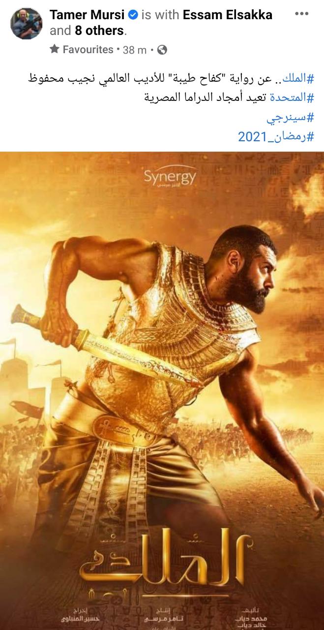 ونشر تامر مرسي البوستر الرسمي عبر حسابه الشخصي على موقع التواصل الاجتماعي “فيسبوك”، وعلق قائلًا: “الملك، عن رواية كفاح طيبة للأديب العالمي نجيب محفوظ، المتحدة تعيد أمجاد الدراما المصرية، سينرجي، رمضان 2021”.