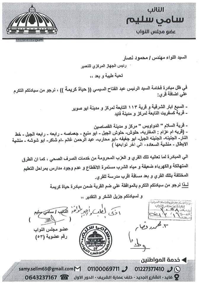 تقدم سامي سليم، عضو مجلس النواب، بمحافظة الإسماعيلية، بطلب إحاطة لضم 4 قرى محرومة من الخدمات، لمبادرة حياة كريمة.
