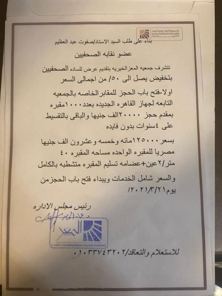 قال الصحفي صفوت عبدالعظيم، المرشح لعضوية مجلس نقابة الصحفيين، إنه حصل على تخفيض بنسبة 50% لعدد 1000 مقبرة لدفن الموتي من ذوي الزملاء والزميلات الصحفيين، مقدمة من جمعية المعز الخيرية.