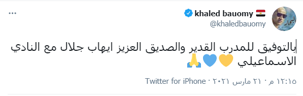 وكتب خالد بيومي عبر حسابه الرسمي على موقع التواصل الاجتماعي "تويتر"، بالتوفيق للمدرب القدير والصديق العزيز إيهاب جلال مع النادي الإسماعيلي".