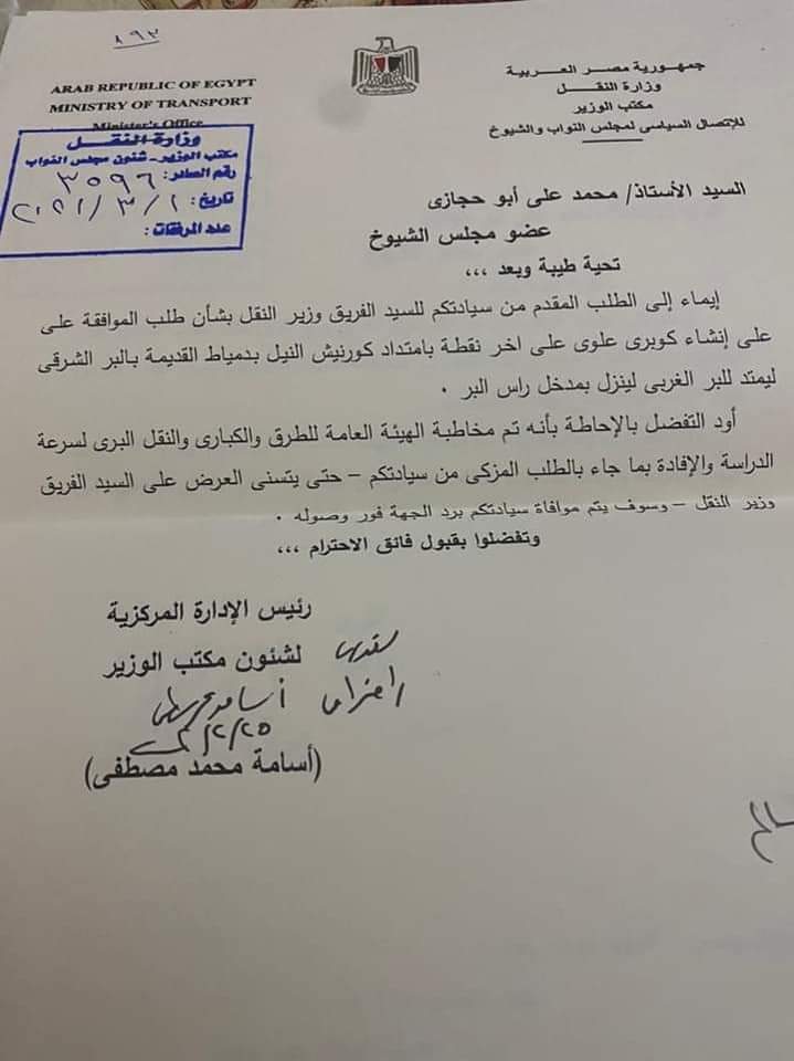 وأكد عضو مجلس الشيوخ أنه تلقى إفادة من رئيس الإدارة المركزية لشئون مكتب الوزير بأنه تم مخاطبة الهيئة العامة للطرق والكباري والنقل البري لسرعة دراسة الطلب والإفادة للعرض على الوزير.