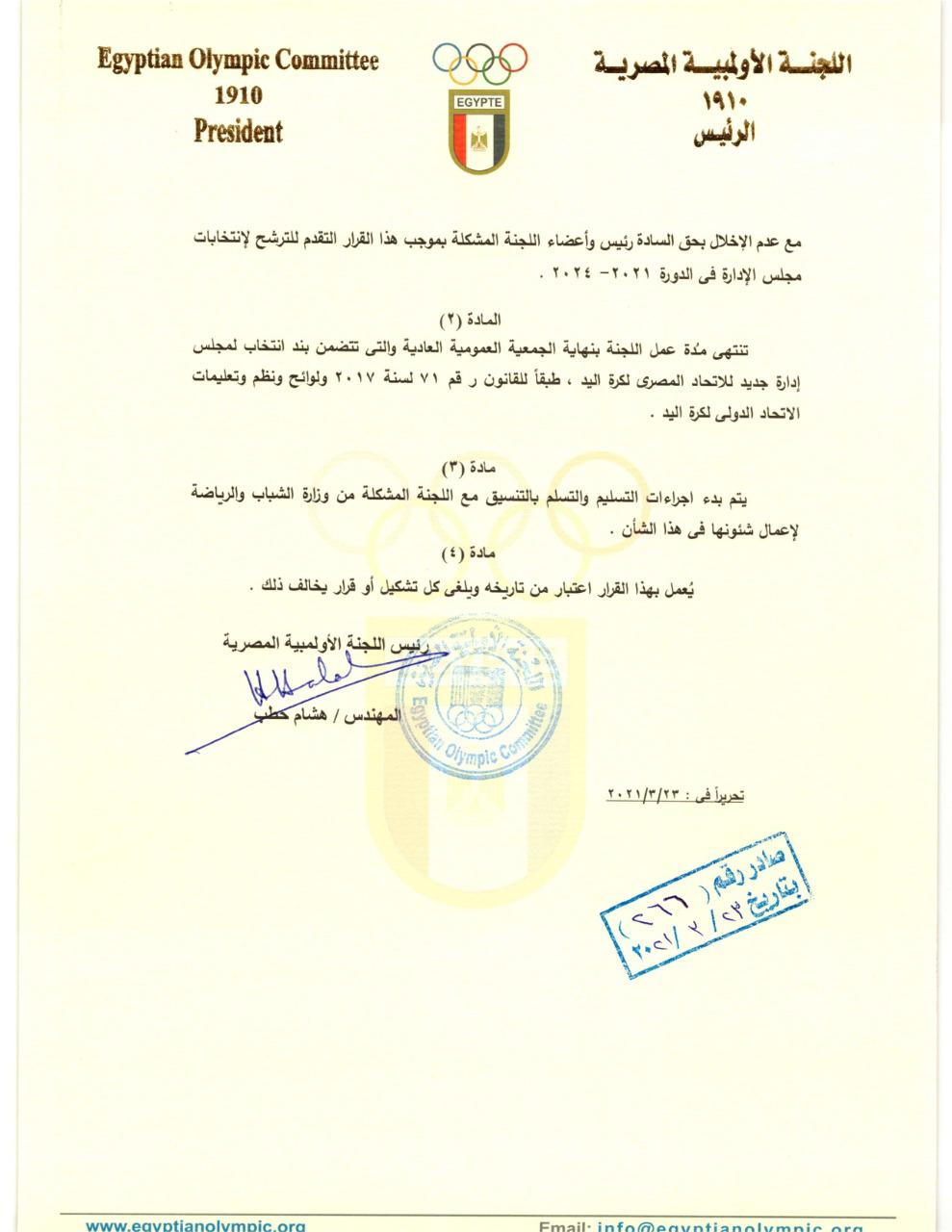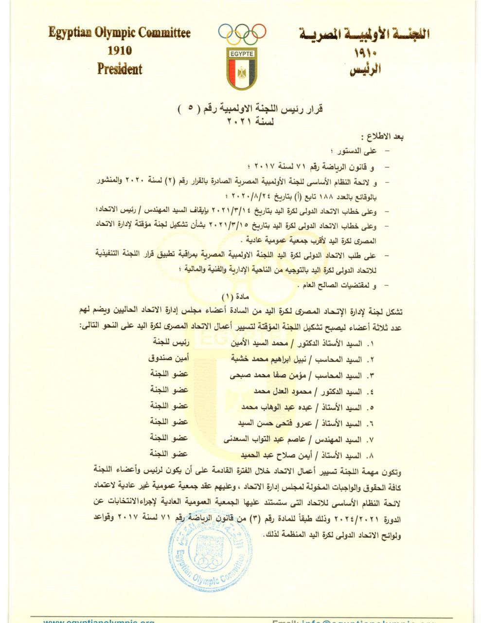 وجاء في القرار، بعد الاطلاع على الدستور وقانون الرياضة رقم 71 لسنة 2017 ولائحة النظام الأساسى للجنة الأولمبية المصرية الصادرة بالقرار رقم (2) لسنة 2020 والمنشور بالوقائع بالعدد 188 تابع (أ) بتاريخ 24/8/2020 وعلى خطاب الاتحاد الدولى لكرة اليد بتاريخ 14/3/2021 بإيقاف رئيس الاتحاد وعلى خطاب الاتحاد الدولى لكرة اليد بتاريخ 15/3/2021 بشأن تشكيل لجنة مؤقتة لإدارة الاتحاد المصرى لكرة اليد، لأقرب جمعية عمومية عادية، وعلى طلب الاتحاد الدولى لكرة اليد اللجنة الأولمبية المصرية بمراقبة تطبيق قرار اللجنة التنفيذية للاتحاد الدولى لكرة اليد بالتوجيه من الناحية الإدارية والفنية والمالية.