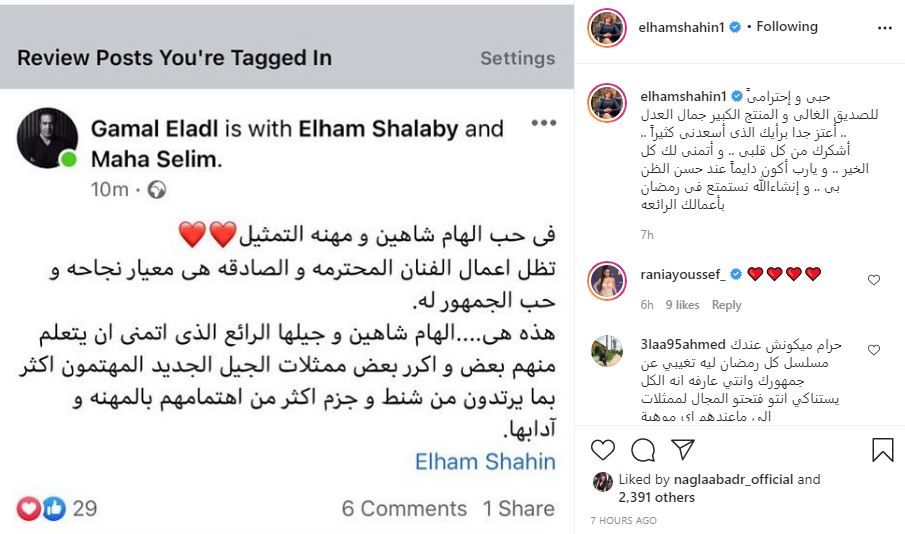 وكتبت إلهام شاهين عبر حسابها الشخصي بموقع الصور والفيديوهات القصيرة “انستجرام”، وقالت لجمال العدل: “حبى واحترامي للصديق الغالي والمنتج الكبير جمال العدل.. أعتز جدا برأيك الذي أسعدني كثير، أشكرك من كل قلبي، وأتمنى لك كل الخير، ويا رب أكون دايما عند حسن الظن بي،، وإن شاء الله نستمتع في رمضان بأعمالك الرائعة”.
