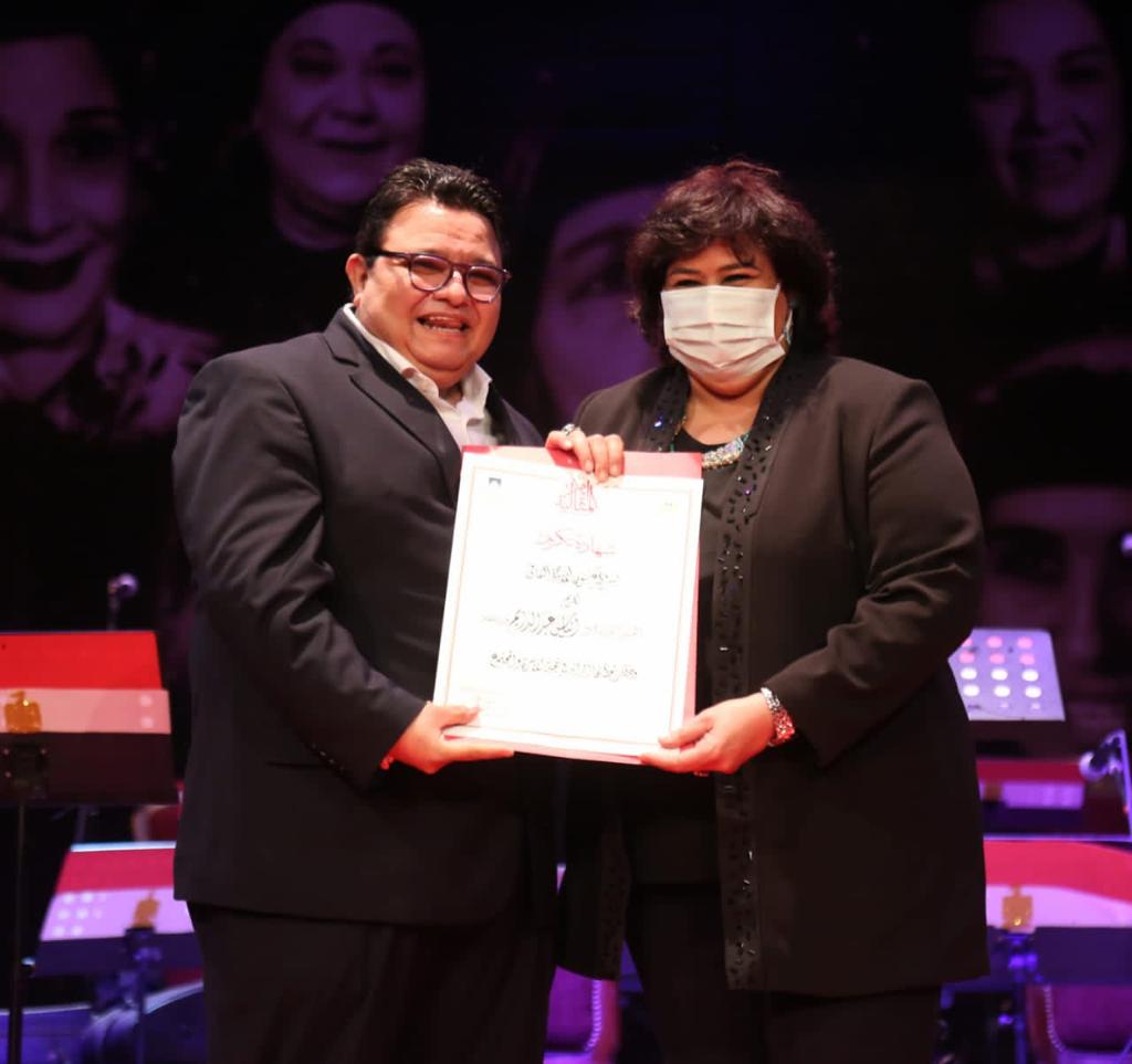 كما أهدى الفنان خالد جلال شهادة تقدير للفنانة الدكتورة إيناس عبد الدايم، وزيرة الثقافة، تكريمًا لها باعتبارها أمًّا مصرية، ونموذجًا للمرأة التي أسهمت بدور رائد في خدمة الثقافة والمجتمع، وقال إننا الليلة نحتفي بأجمل وأهم وأنبل رسالة تحملتها المرأة منذ بداية الخليقة، هذه المرأة التي تشهد في العصر الحالي تكريمًا وتقديرًا لدورها المهم في إعداد أجيال مصرية رشيدة تحمل راية التنمية والكفاح والصبر من أجل غد مشرق، والتي تبوأت في عهد فخامة الرئيس عبد الفتاح السيسي أرفع المناصب، واحتلت أرقى مكانة، وليس الأمر ببعيد فنحن اليوم نحتفل بالأم المصرية تحت رعاية أول وزيرة للثقافة المصرية، الفنانة الدكتورة إيناس عبد الدايم.