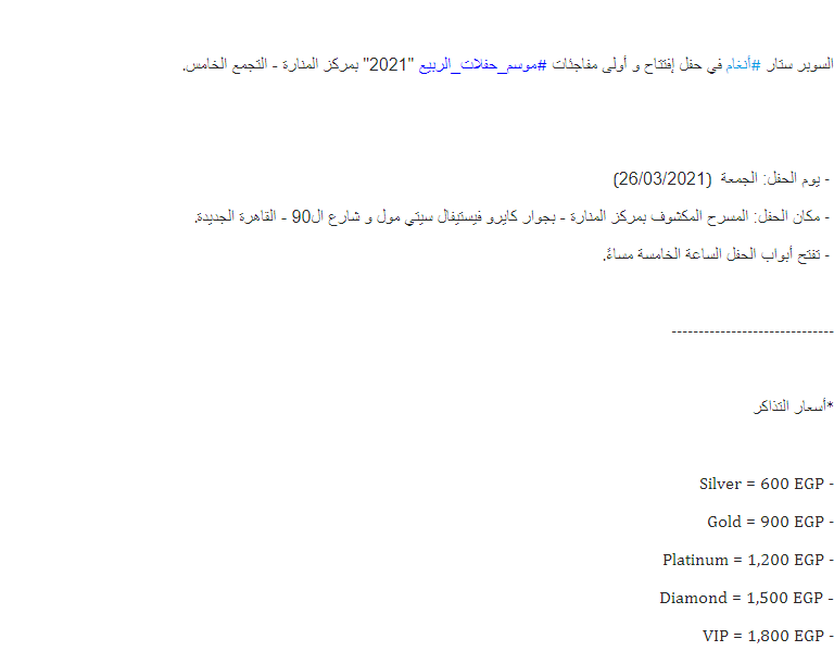 وتبدأ أسعار تذاكر الحفل من 600 جنيه للتذكرة التي تنتمي لفئة الـ"سيلفير"، و900 جنيه لفئة الـ"جولد"، و1200 جنيه "البلاتينيوم"، و"الدياموند" 1500، أما الـ"vip" بـ1800 جنيه مصري.