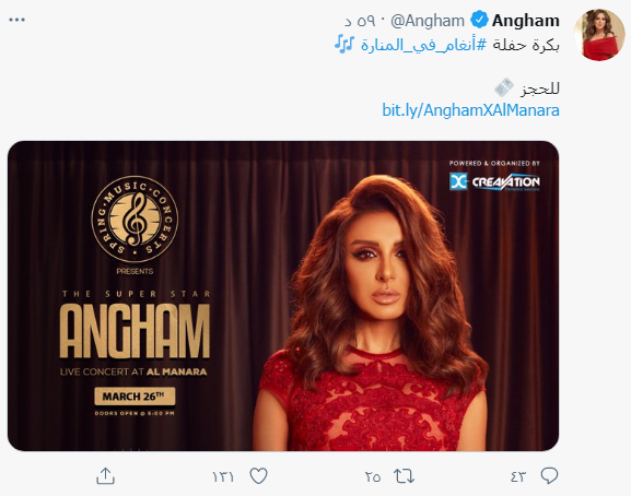 وروجت أنغام للحفل من خلال تغريدة نشرتها عبر حسابها الرسمي بموقع التغريدات “تويتر”، حيث كتبت فيها: “بكرة حفلة أنغام في المنارة”.