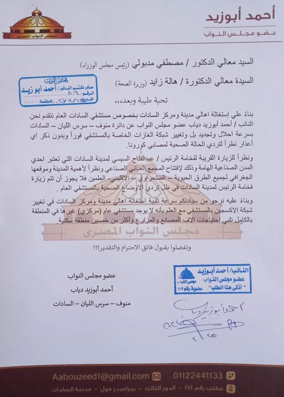 ووجه النائب أحمد أبو زيد، عضو مجلس النواب، طلبًا للدكتور مصطفى مدبولي، رئيس مجلس الوزراء، والدكتورة هالة زايد، وزيرة الصحة، بدعم مستشفى السادات العام، بعد شكاوى واستغاثات الأهالي، مطالبًا بسرعة إحلال وتجديد بل تغيير شبكة الغازات الخاصة بالمستشفى على الفور، وبدون ذكر أعذار نظرًا لتدريب الحالة الصحية لمصابي فيروس كورونا.