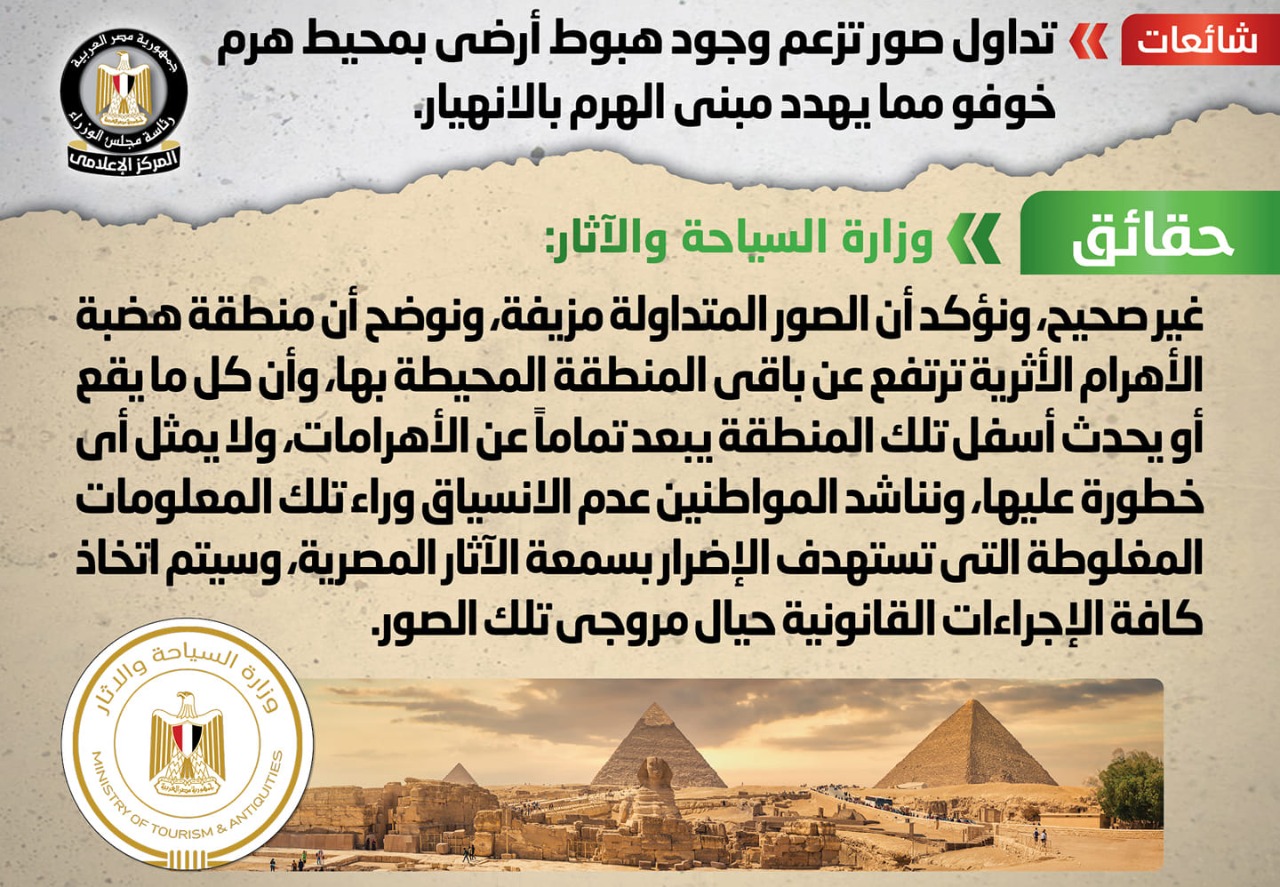 وقال المركز أنه تواصل مع وزارة السياحة والآثار، والتي نفت تلك الأنباء، مُؤكدةً أنه لا صحة لوجود هبوط أرضي بمحيط هرم خوفو مما يهدد مبنى الهرم بالانهيار، وأن الصور المتداولة مزيفة، مُوضحةً أن منطقة هضبة الأهرام الأثرية ترتفع عن باقي المنطقة المحيطة بها، وأن كل ما يقع أو يحدث أسفل تلك المنطقة يبعد تماماً عن الأهرامات، ولا يمثل أي خطورة عليها، مُناشدةً المواطنين عدم الانسياق وراء تلك المعلومات المغلوطة التي تستهدف الإضرار بسمعة الآثار المصرية، وسيتم اتخاذ كافة الإجراءات القانونية حيال مروجي تلك الصور.