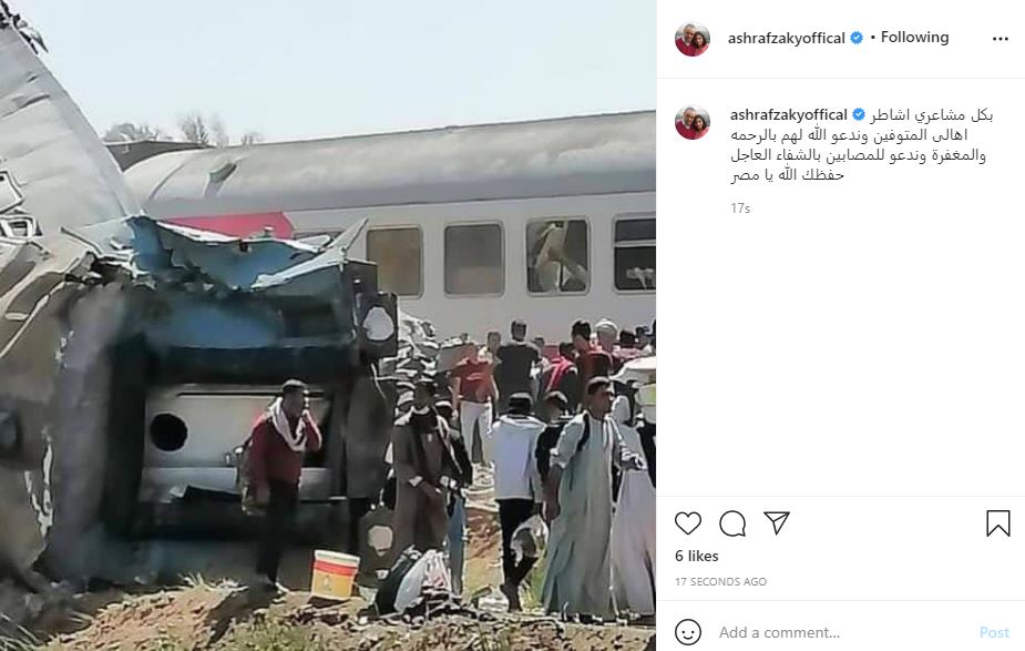 ونشر أشرف زكي صورة من الحادث، عبر حسابه الشخصي بموقع الصور والفيديوهات القصيرة “انستجرام”، وقال: “بكل مشاعري أشاطر أهالي المتوفين، وندعو الله لهم بالرحمة والمغفرة، وندعو للمصابين بالشفاء العاجل حفظك الله يا مصر”.