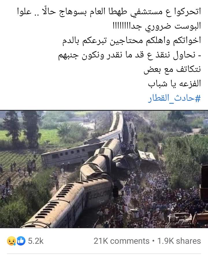 وناشد مستخدمو مواقع التواصل الاجتماعي، الأشخاص القريبين من حادث قطاري سوهاج، بالذهاب فورًا إلى المستشفيات، للتبرع، فمن لم يستطع الذهاب، ساهم بشكل كبير في نشر الخبر.