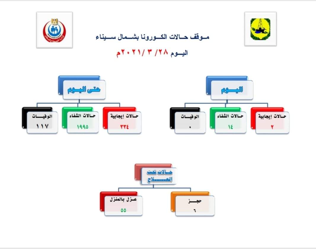 ووصل عدد المواطنين المصابين بفيروس كورونا في محافظة شمال سيناء والذين يتلقون العلاج داخل المستشفيات إلى 6 حالات، يتلقون العلاج تحت إشراف طبي كامل، وتنفيذ البروتوكول العلاجي لوزارة الصحة المصرية، كما يطبق61 مواطن مصاب بفيروس كورونا المستجد، العزل المنزلي في المنازل، نظرًا لاستقرار حالتهم الصحية، ويتم متابعتهم عن طريق الفرق الطبية.
