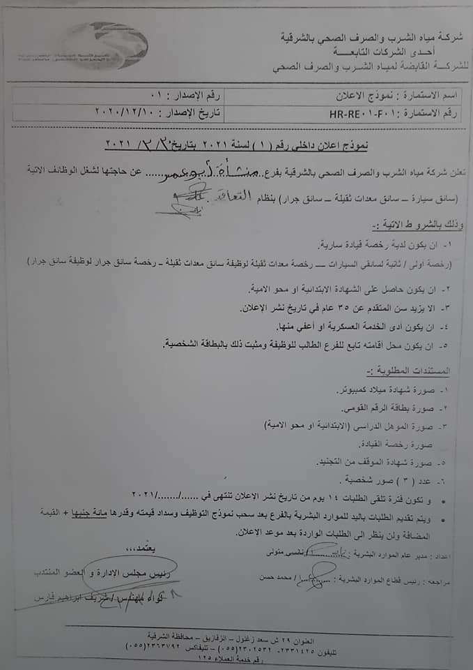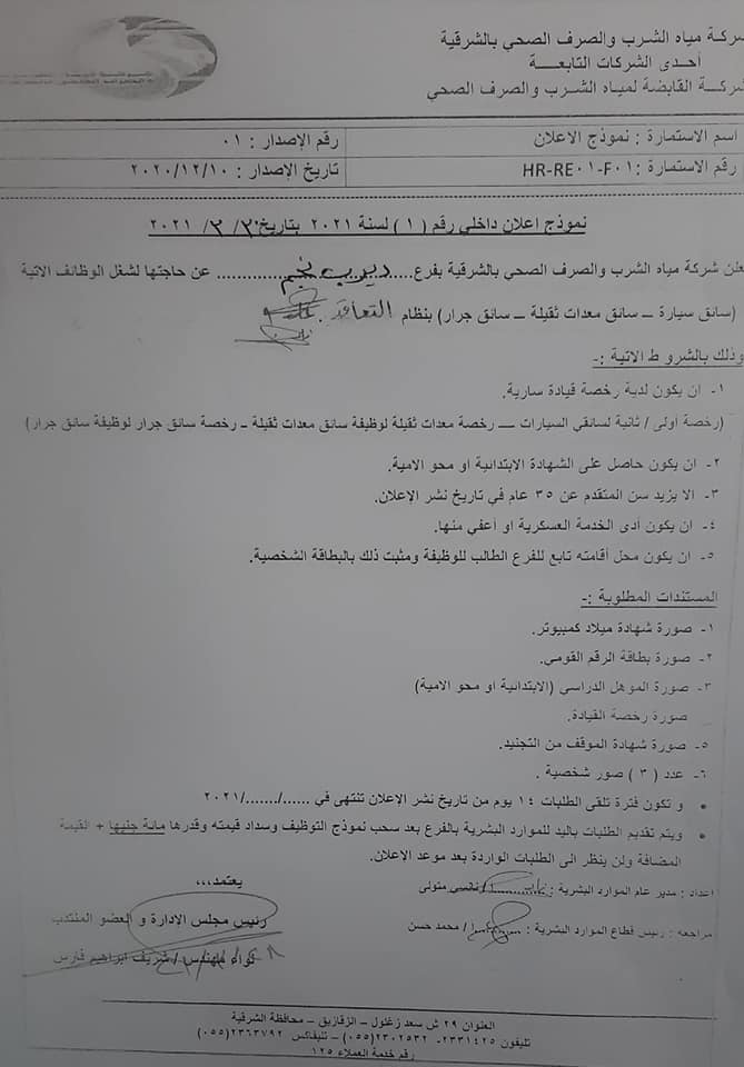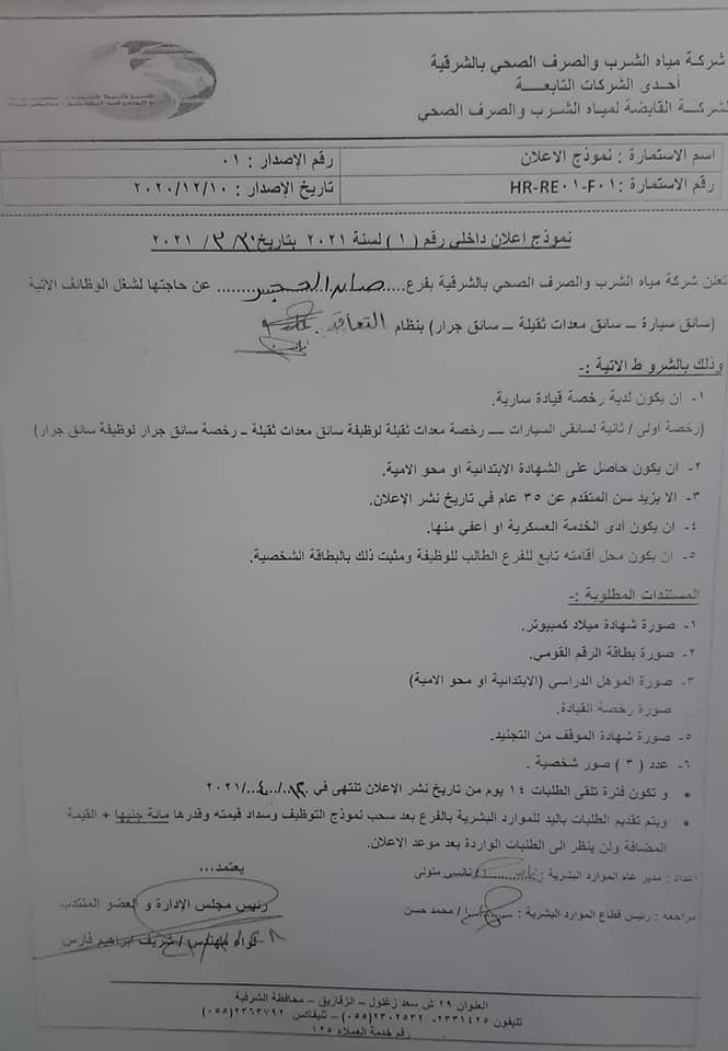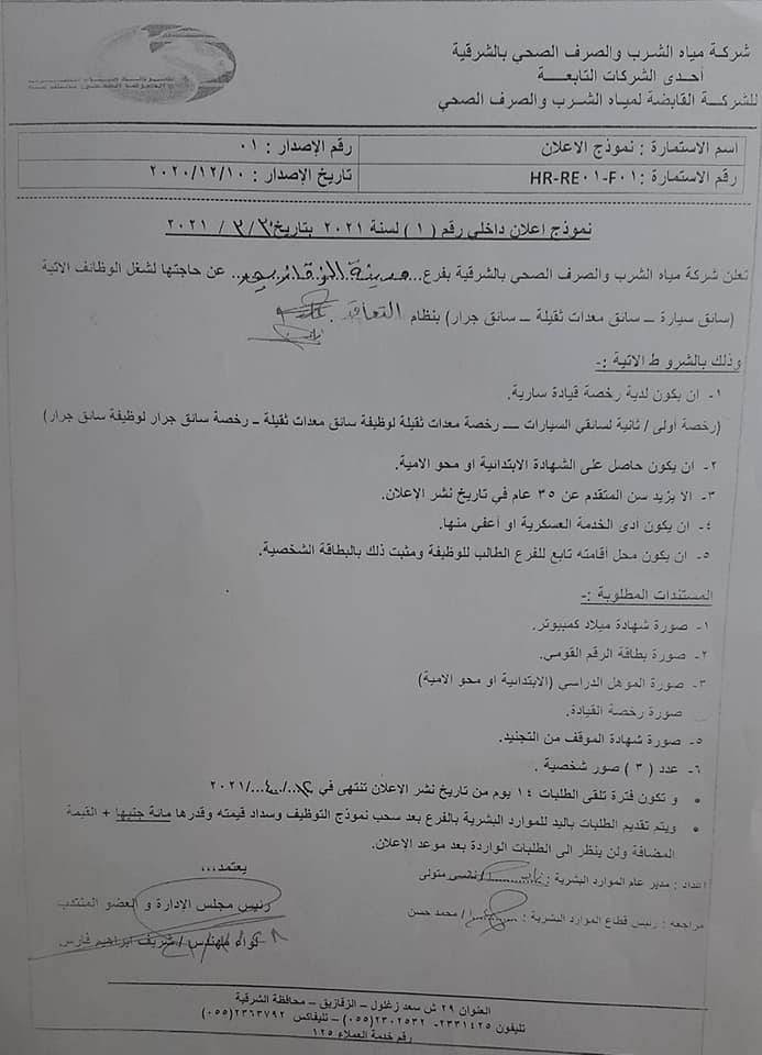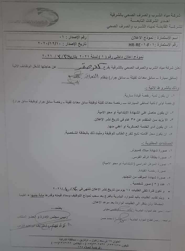 أعلنت شركة مياه الشرب والصرف الصحي بمحافظة الشرقية، برئاسة وإشراف المهندس شريف فارس، رئيس مجلس الإدارة والعضو المنتدب للشركة، عن حاجتها لعدد من الوظائف، جميعها لسائقين، وذلك بعدد من فروع الشركة بنطاق المحافظة.