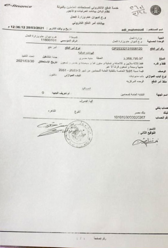 نقيب المحامين يتسلم 9 ملايين جنيه أتعاب محاماة من وزارة العدل (مستند)