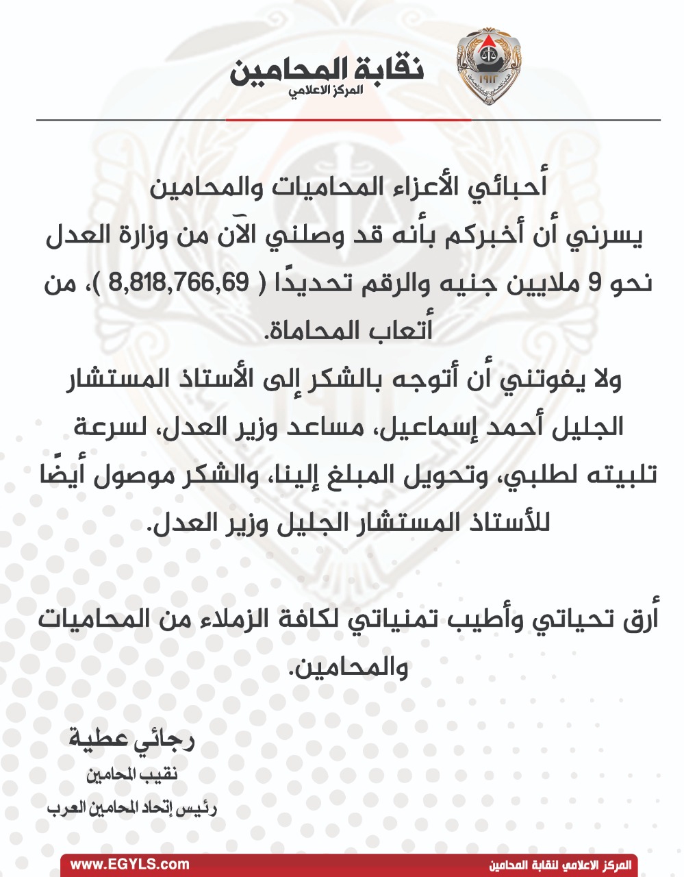 أعلن رجائي عطية، نقيب المحامين، أن وزارة العدل حولت إلى حساب النقابة اليوم الثلاثاء، نحو 9 ملايين جنيه من مستحقات النقابة الخاصة بأتعاب المحاماة.