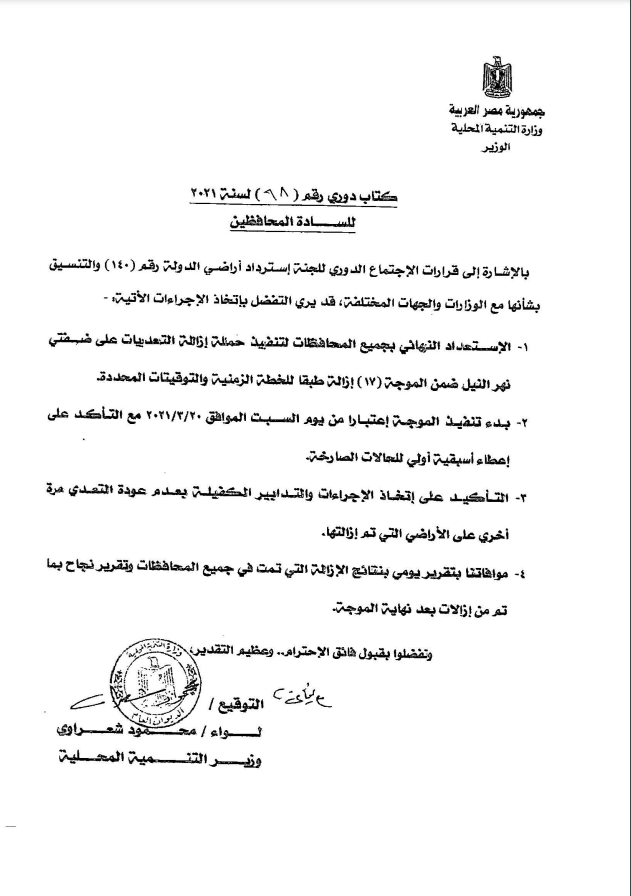 1- الاستعداد النهائي بجميع المحافظات لتنفيذ حمالتي إزالة التعديات على ضفتي نهر النيل ضمن الموجة (17) إزالة طبقا للخطة الزمنية والتوقيتات المحددة.