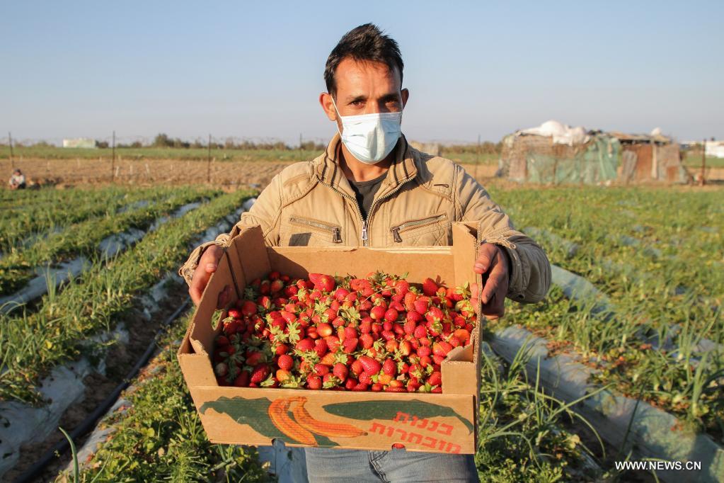ويواجه المزارعون الفلسطينيون مشكلة في تسويق منتجاتهم من الفراولة وسط تفشي مرض فيروس كورونا الجديد (كوفيد-19).