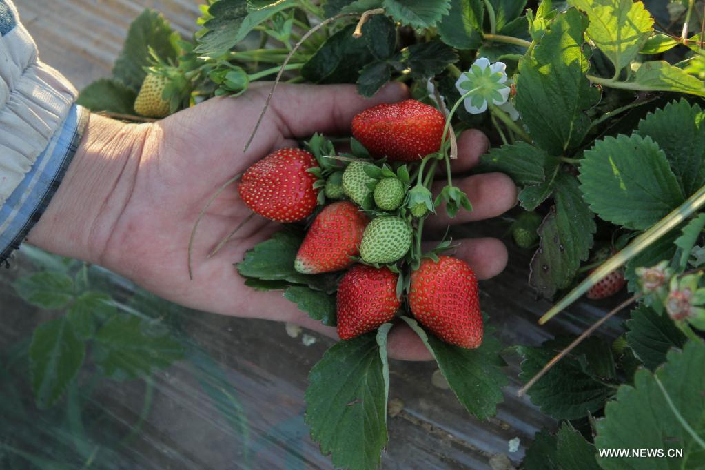 صورة ملتقطة لمزارع فلسطيني يعرض الفراولة في مزرعته بمدينة بيت لاهيا بشمالي قطاع غزة.