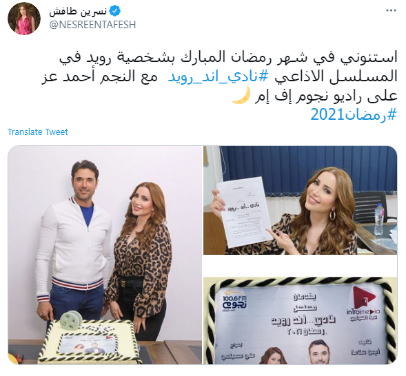 أعلنت الفنانة نسرين طافش، أنها تشارك في الموسم الرمضاني المقبل 2021، بمسلسل إذاعي تتعاون فيه مع الفنان أحمد عز.