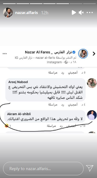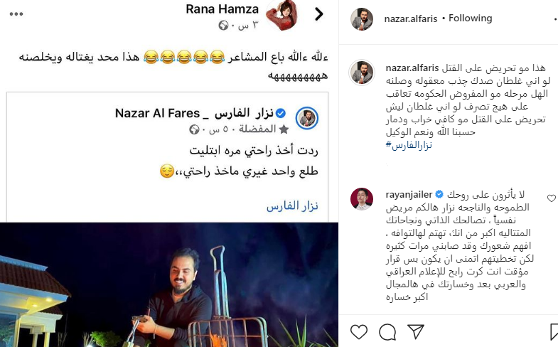 وعلق نزار على هذه التهديدات، قائلًا: "هذا مو تحريض على القتل، لو اني غلطان صدك چذب، معقوله وصلنه الهل مرحله، مو المفروض الحكومه تعاقب على هيج تصرف، لو اني غلطان ليش تحريض على القتل، مو كافي خراب.. ودمار حسبنا الله ونعم الوكيل".