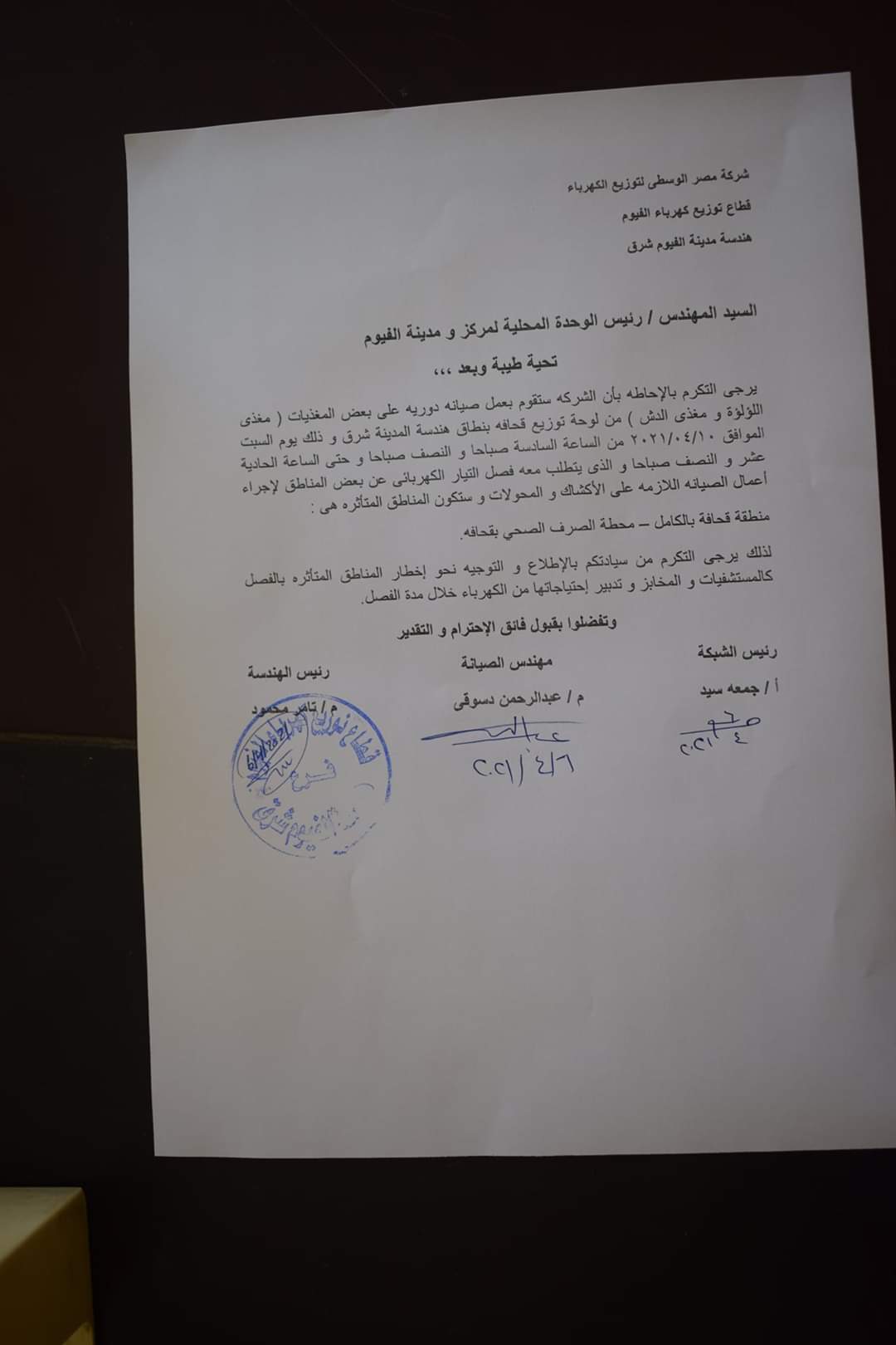 وأحاط قطاع توزيع الكهرباء بالفيوم، مجلس مدينة الفيوم، بإخطار المناطق المتأثرة بفصل التيار الكهربائي، السبت المُقبل، عن منطقة قحافة بالكامل، ومحطة صرف قحافة، "المستشفيات، والمخابز"، من تدبير كامل احتياجاتهم خلال مدة فصل الكهرباء.