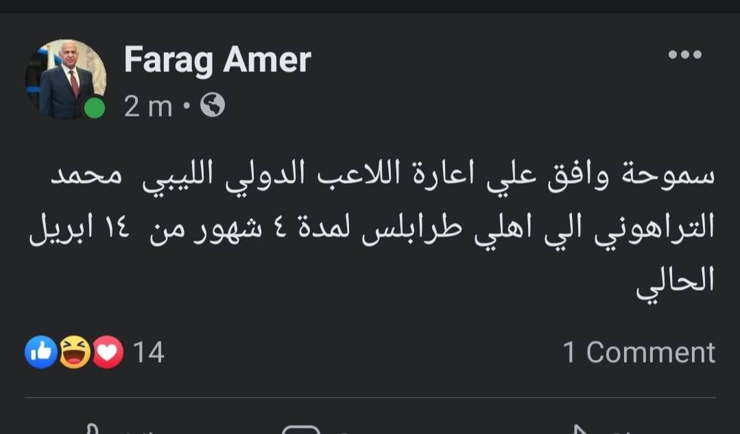 وكتب “عامر” عبر صفحته الشخصية على موقع التواصل الاجتماعي “فيس بوك”: "سموحة وافق على إعارة اللاعب الدولي الليبي محمد الترهوني إلى أهلي طرابلس لمدة 4 أشهر من 14 أبريل الحالي".