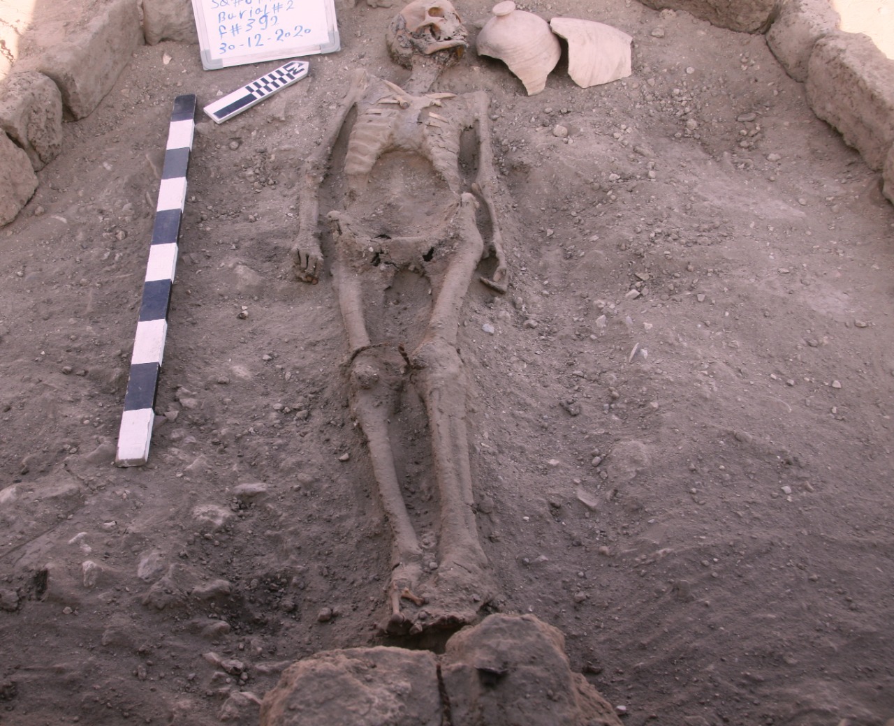 كما تم العثور على دفنة رائعة لشخص ما بذراعيه ممدودتين إلى جانبه، وبقايا حبل ملفوف حول ركبتيه، ويعد موقع ووضع هذا الهيكل العظمي غريب نوعًا ما، وهناك المزيد من البحث حول هذا الأمر.
