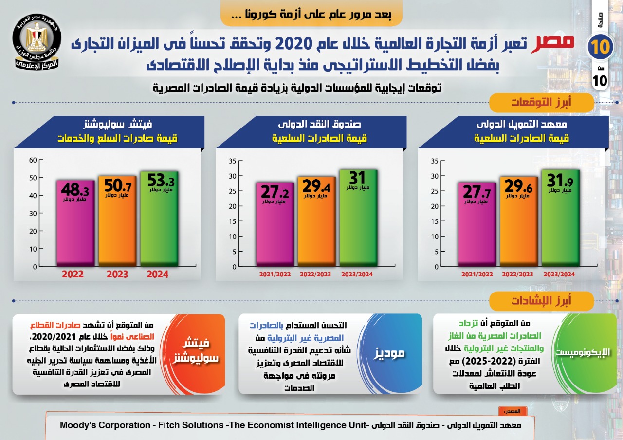 وأشار التقرير إلى توقع صندوق النقد الدولي بأن تسجل قيمة الصادرات السلعية نحو 27.2 مليار دولار عام 2021/2022، و29.4 مليار دولار عام 2022/2023، و31 مليار دولار عام 2023/2024، بينما توقعت فيتش سوليوشنز أن تسجل قيمة صادرات السلع والخدمات نحو 48.3 مليار دولار عام 2022، و50.7 مليار دولار عام 2023، و53.3 مليار دولار عام 2024.