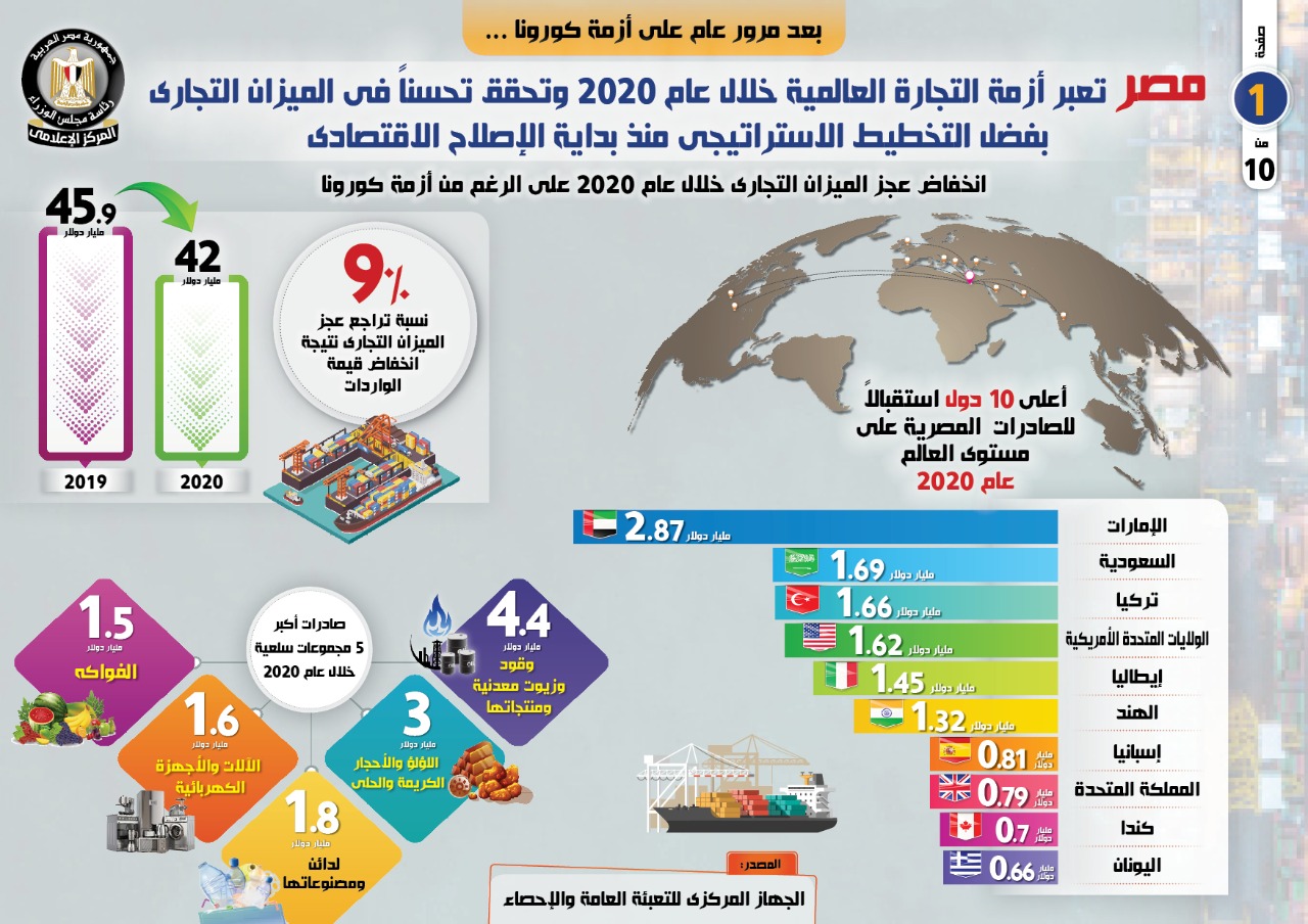 وفي هذا الصدد، نشر المركز الإعلامي لمجلس الوزراء، تقريراً تضمن إنفوجرافات تسلط الضوء على عبور مصر أزمة التجارة العالمية خلال عام 2020 وتحقيقها تحسناً في الميزان التجاري بفضل التخطيط الاستراتيجي منذ بداية الإصلاح الاقتصادي، وذلك بعد مرور عام على أزمة كورونا.