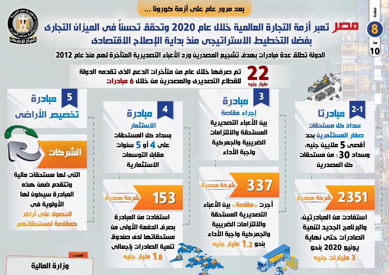 وذكر التقرير أن هناك 1580 شركة مصدرة انضمت إلى المرحلة الأولى من المبادرة السابق ذكرها وتم الصرف لعدد 1069 شركة كل المبالغ المتأخرة لدى صندوق تنمية الصادرات بقيمة 12.2 مليار جنيه خلال شهري نوفمبر وديسمبر 2020.