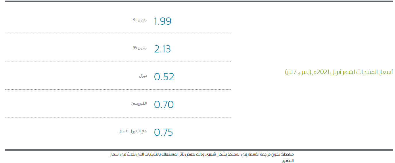 بنزين 91: بسعر 1.99 ريال لكل لتر بدلا من 1.90 ريال في شهر مارس الماضي.