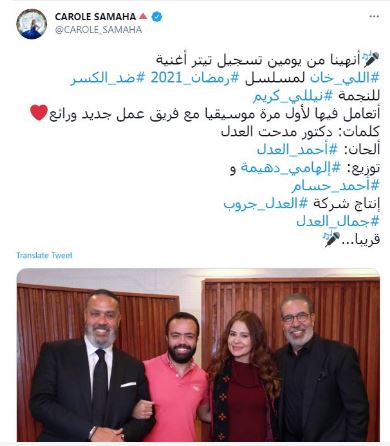 انتهت النجمة كارول سماحة من تسجيل أغنية “اللي خان”، تتر مسلسل “ضد الكسر” للنجمة نيللي كريم، والذي يشارك في المارثون الرمضاني المقبل 2021، والأغنية كلمات مدحت العدل ألحان أحمد العدل، توزيع إلهامي دهيمة وأحمد حسام.