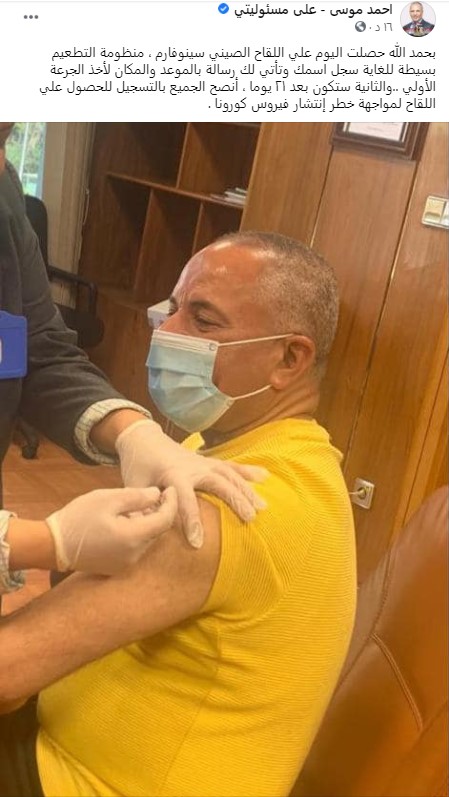 وكتب موسى عبر حسابه الرسمي بموقع التواصل الاجتماعي “فيس بوك”، منشورًا أعلن فيه تفاصيل اللقاح الذي حصل عليه، وهو اللقاح الصيني “سينوفارم”.
