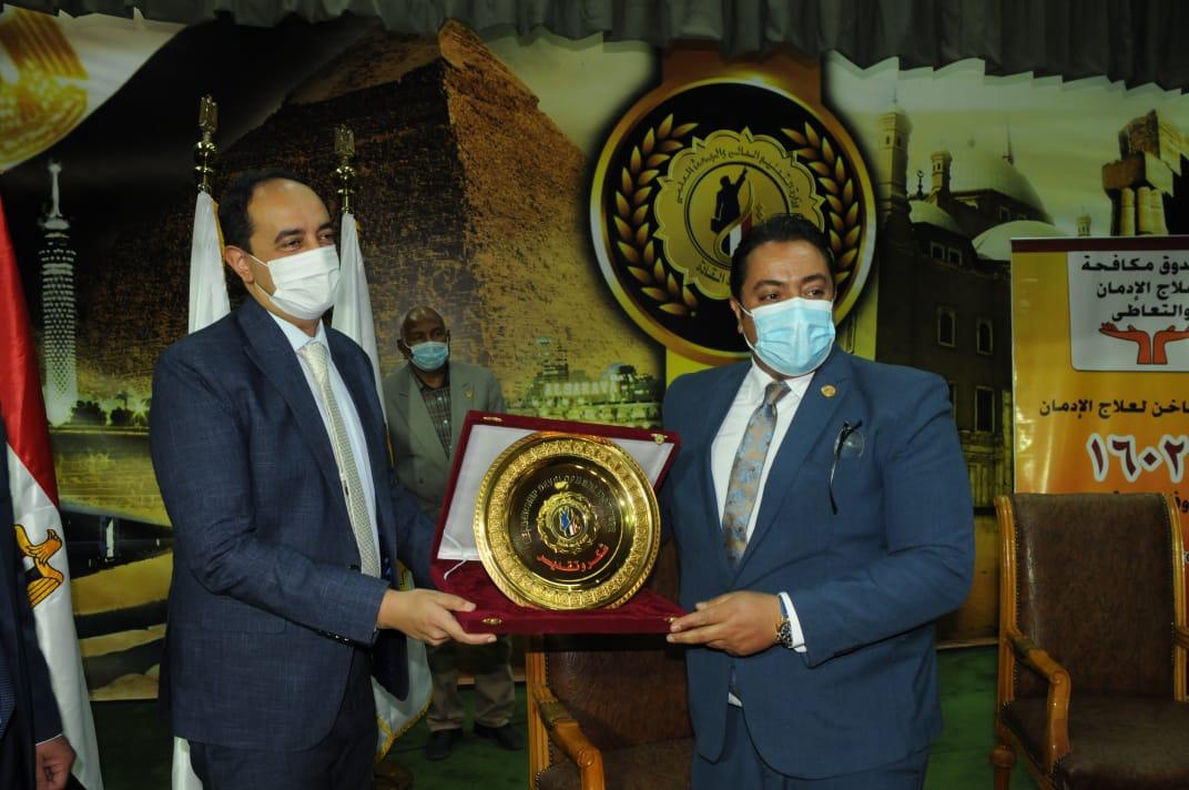 وأهدى الدكتور كريم إمام، مدير معهد إعداد القادة بجامعة حلوان، عمرو عثمان درع المعهد تقديرًا لجهود الصندوق المبذولة وتنفيذ العديد من المبادرات التوعوية من أجل حماية الشباب من الإدمان بجانب توفير الخدمات العلاجية مجانًا ووفقًا للمعايير الدولية .