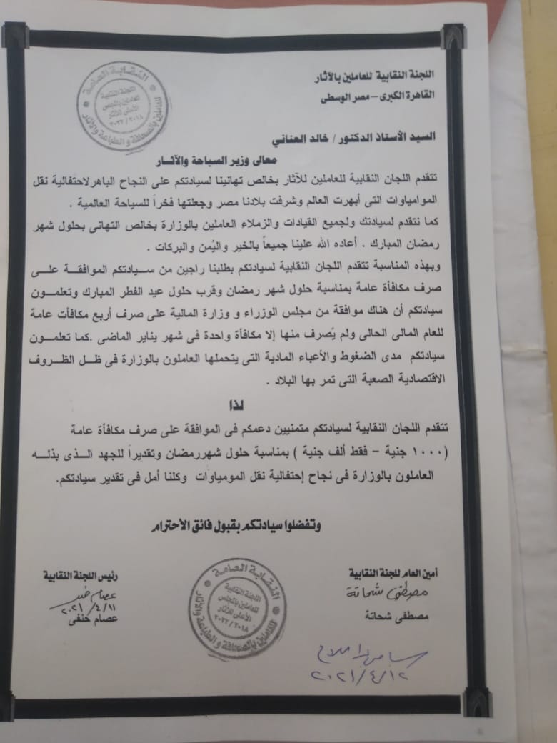وتابع الخطاب، كما تعلمون سيادتكم مدى الضغوط والأعباء المادية التي يتحملها العاملون بالوزارة في ظل الظروف الاقتصادية الصعبة التي تمر بها البلاد، لذا تتقدم اللجان النقابية لسيادتكم متمنين دعمكم في الموافقة على صرف مكافأة عامة “1000 جنيه- فقط ألف جنيه” بمناسبة حلول شهر رمضان وتقديرًا للجهد الذي بذله العاملون بالوزارة في نجاح احتفالية نقل المومياوات، وكلنا أمل في تقدير سيادتكم، وتفضلوا سيادتكم بقبول فائق الاحترام.
