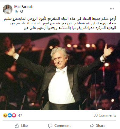 ونشرت مي فاروق، صورة للمايسترو، عبر حسابها الشخصي بموقع التواصل الاجتماعي “فيس بوك”، قائلة: “أرجو منكم جميعا الدعاء في هذه الليلة المفترجة لأبويا الروحي المايسترو سليم سحاب وزوجته، وأن يتم شفاهم علي خير، هم في أمس الحاجة للدعاء هم في الرعاية المركزة دعواتكم يقوموا بالسلامة ويعدوا أزمتهم علي خير".