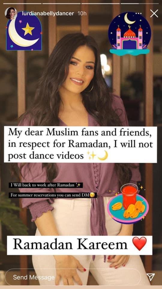 وكتبت لورديانا في “ستوري” عبر حسابها الشخصي على موقع تبادل الصور والفيديوهات القصيرة “انستجرام”: “إلى معجبيني وأصدقائي المسلمين، احترامًا لشهر رمضان الكريم، أنا مش هنشر أي فيديوهات رقص”.