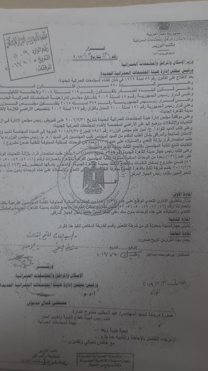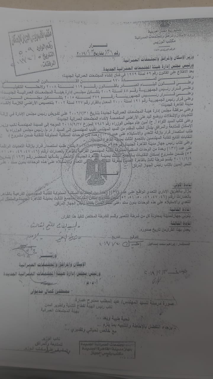 وتتقدم نقابة المهندسين بجزيل الشكر والتقدير للسيد اللواء محمود توفيق، وزير الداخلية وكافة القيادات الأمنية بوزارة الداخلية، والدكتور عاصم الجزار، وزير الإسكان والمرافق والمجتمعات العمرانية، وكافة أجهزة شرطة التعمير لعزمهم على إنهاء إخلاء كافة الوحدات السكنية المغتصبة منذ فبراير 2011.