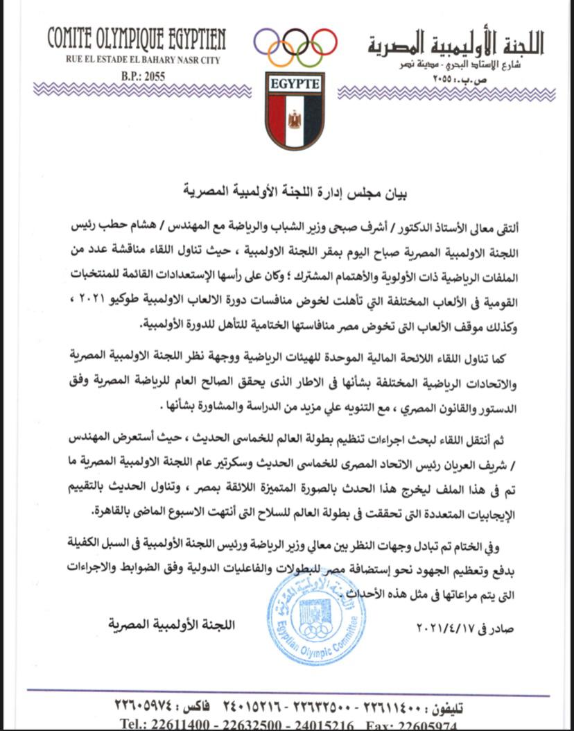 وأصدرت اللجنة الأوليمبية بيانًا جاء نصه كالتالي: "التقى معالى الأستاذ الدكتور أشرف صبحى وزير الشباب والرياضة مع المهندس هشام حطب رئيس اللجنة الاولمبية المصرية صباح اليوم بمقر اللجنة الاولمبية ، حيث تناول اللقاء مناقشة عدد من الملفات الرياضية ذات الأولوية والأهتمام المشترك؛ وكان على رأسها الاستعدادات القائمة للمنتخبات القومية فى الألعاب المختلفة التي تأهلت لخوض منافسات دورة الألعاب الأولمبية طوكيو 2021، وكذلك موقف الألعاب التى تخوض مصر منافاستها الختامية للتأهل للدورة الأولمبية".