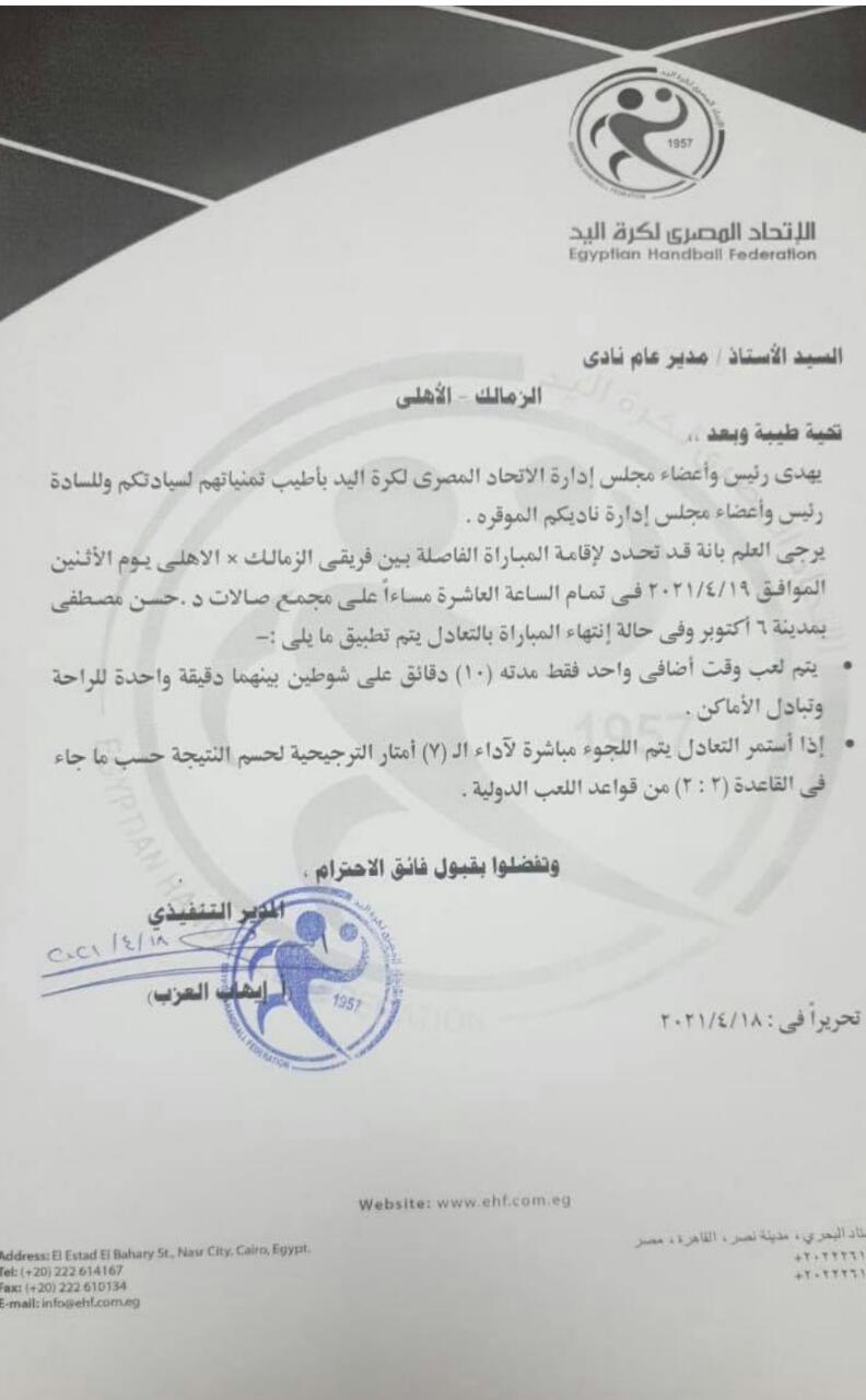 اتحاد كرة اليد يخطر الزمالك بشروط المباراة الفاصلة أمام الأهلي (مستند)