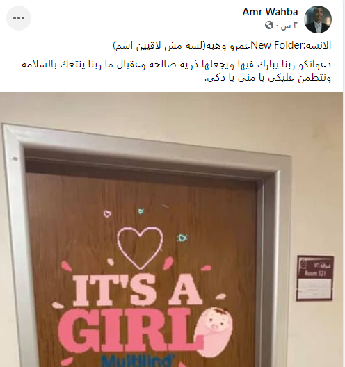 ونشر وهبه صورة لغرفة المستشفى التي بها زوجته، عبر حسابه الرسمي بموقع "فيس بوك"، قائلًا: "الآنسة New Folder عمرو وهبه.. لسة مش لاقيين اسم".