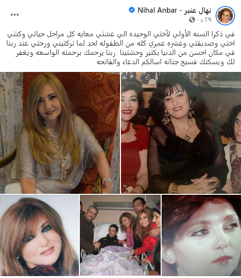 ونشرت نهال مجموعة صور لها مع الراحلة، عبر حسابها الرسمي بموقع التواصل الاجتماعي "فيس بوك"، وعلقت عليها قائلة: "في ذكرى السنة الأولي لأختي الوحيدة، اللي عشتي معايا كل مراحل حياتي وكنتي اختي وصديقتي وعشرة عمري كله من الطفولة لحد لما تركتيني".