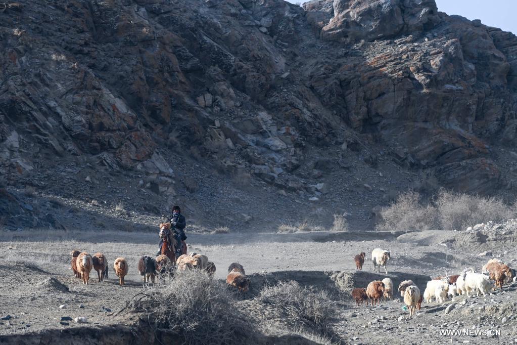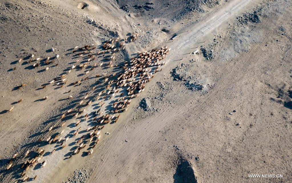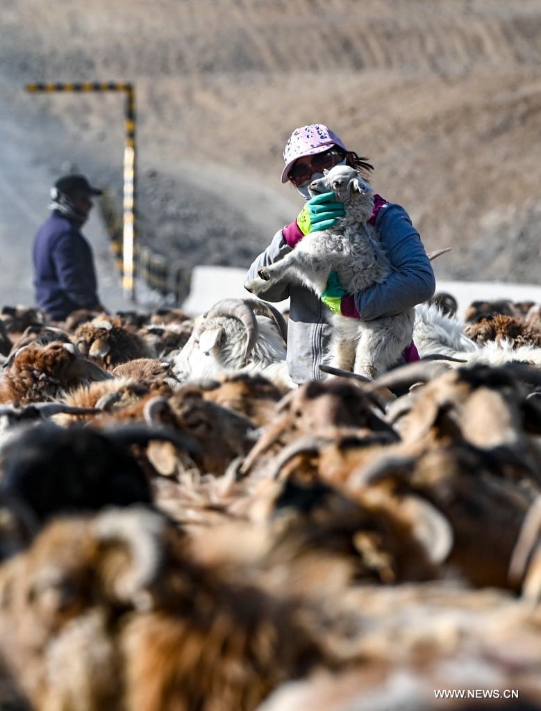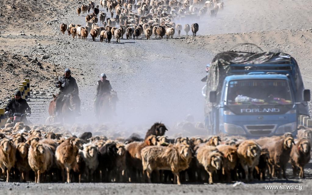 رعاة يقودون الأغنام إلى المراعي الربيعية بشمال غربي الصين