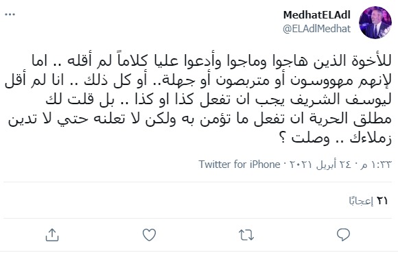 وكتب مدحت العدل، تدوينة عبر حسابه الشخصي بموقع التغريدات القصيرة “تويتر”، وقال: “للأخوة الذين هاجوا وماجوا وادعوا عليا كلاماً لم أقله.. أما لأنهم مهووسون أو متربصون أو جهلة.. أو كل ذلك.. أنا لم أقل ليوسف الشريف يجب أن تفعل كذا او كذا.. بل قلت لك مطلق الحرية أن تفعل ما تؤمن به، ولكن لا تعلنه حتى لا تدين زملاءك.. وصلت؟”.
